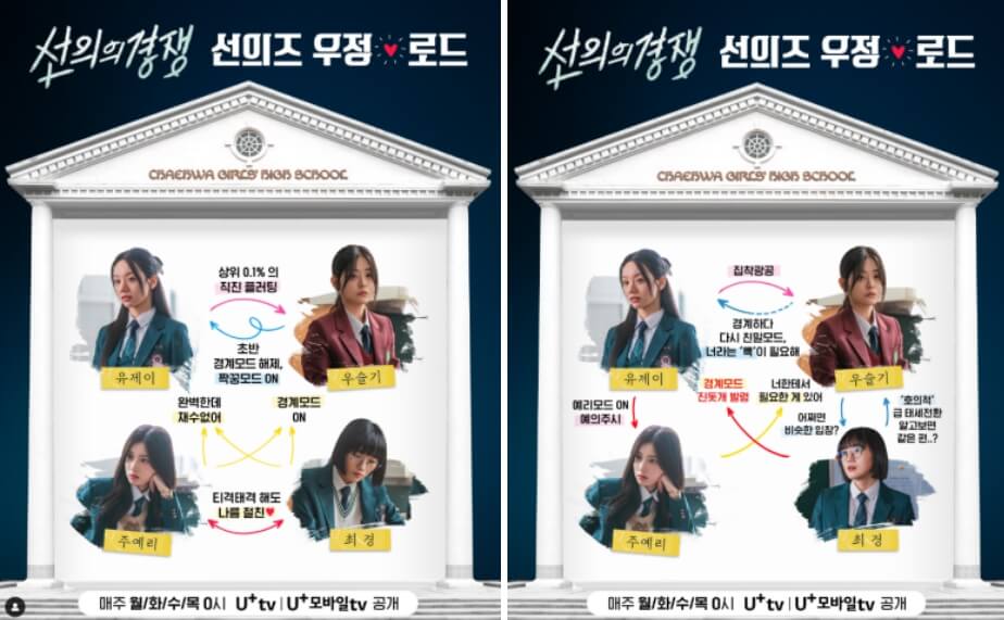 일상 속에서 만날 법한 학생들이지만, 각자 복잡한 사연과 비밀을 지니고 있어요. 주인공 우슬기(정수빈 분)는 채화여고로 전학 온 학생으로, 새로운 환경에서 다양한 인물들과 얽히게 됩니다. 유제이(이혜리 분)는 학교 내에서 뛰어난 성적을 자랑하며, 슬기에게 특별한 관심을 보입니다. 주예리(강혜원 분)와 최경(오우리 분) 역시 각자의 욕망과 비밀을 가지고 이야기에 긴장감을 더합니다.