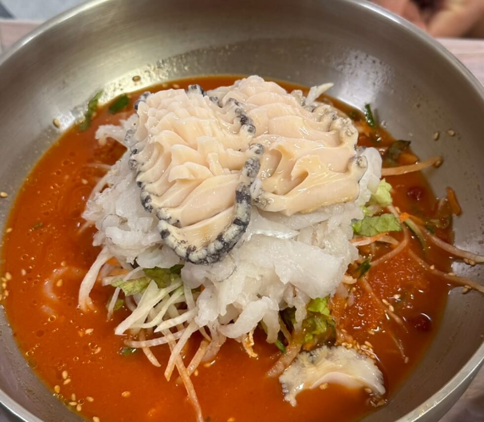 진한 물회 육수가 새콤달콤 해서 해산물과의 조화가 감칠맛 있게 맛있습니다.