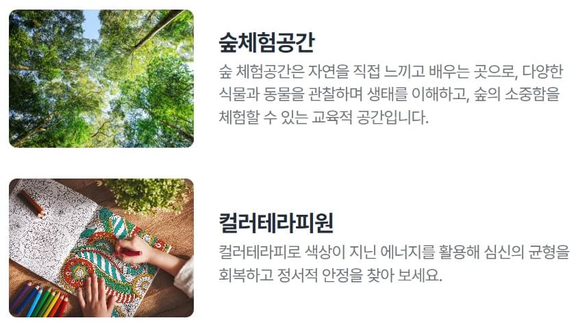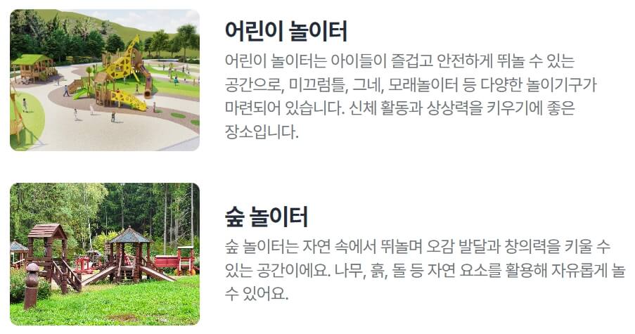 - 숲 체험 공간: 다양한 동식물과 생태계 체험 가능