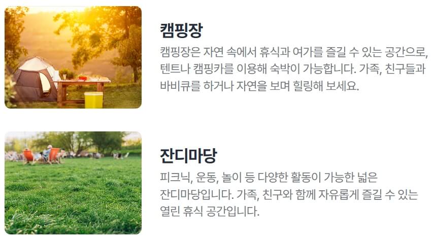 - 잔디마당: 캠핑 외에도 체육 활동, 피크닉 가능