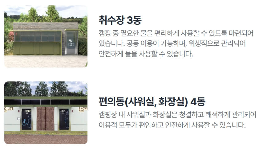 - 샤워실 & 화장실: 총 4동, 청결하고 안전하게 유지